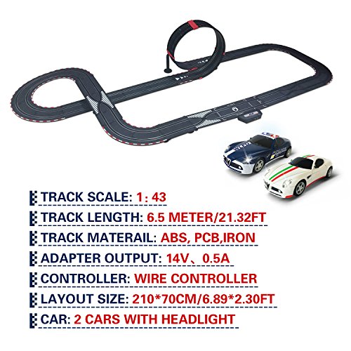 The track is 6.5M / 21.3ft long. This track has 3 basic layouts, included looping, banked corner, bridge underpass