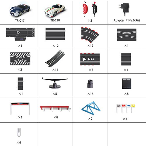 Set includes: ASR control box with built-in bluetooth, track pieces, controller*2, vehicle*2, transformer, and other accessories.