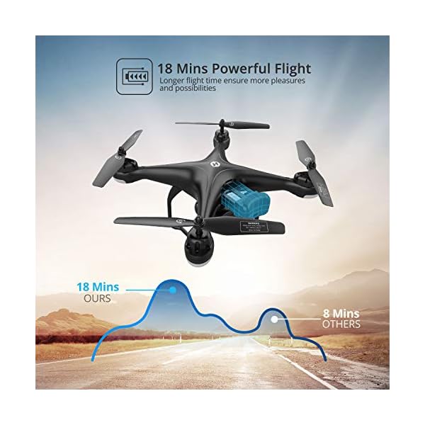 18 Min Powerful flight: Double flight time to same level drones. More pleasures and possibilities! With 300M control range, you can go farther and see broader.