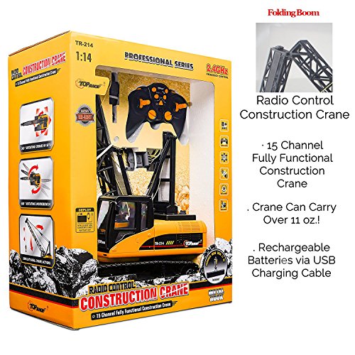Top Race 15 Channel Remote Control Crane, Proffesional Series, 1:14 Scale – Battery Powered RC Construction Toy Crane with Heavy Metal Hook (TR-214)